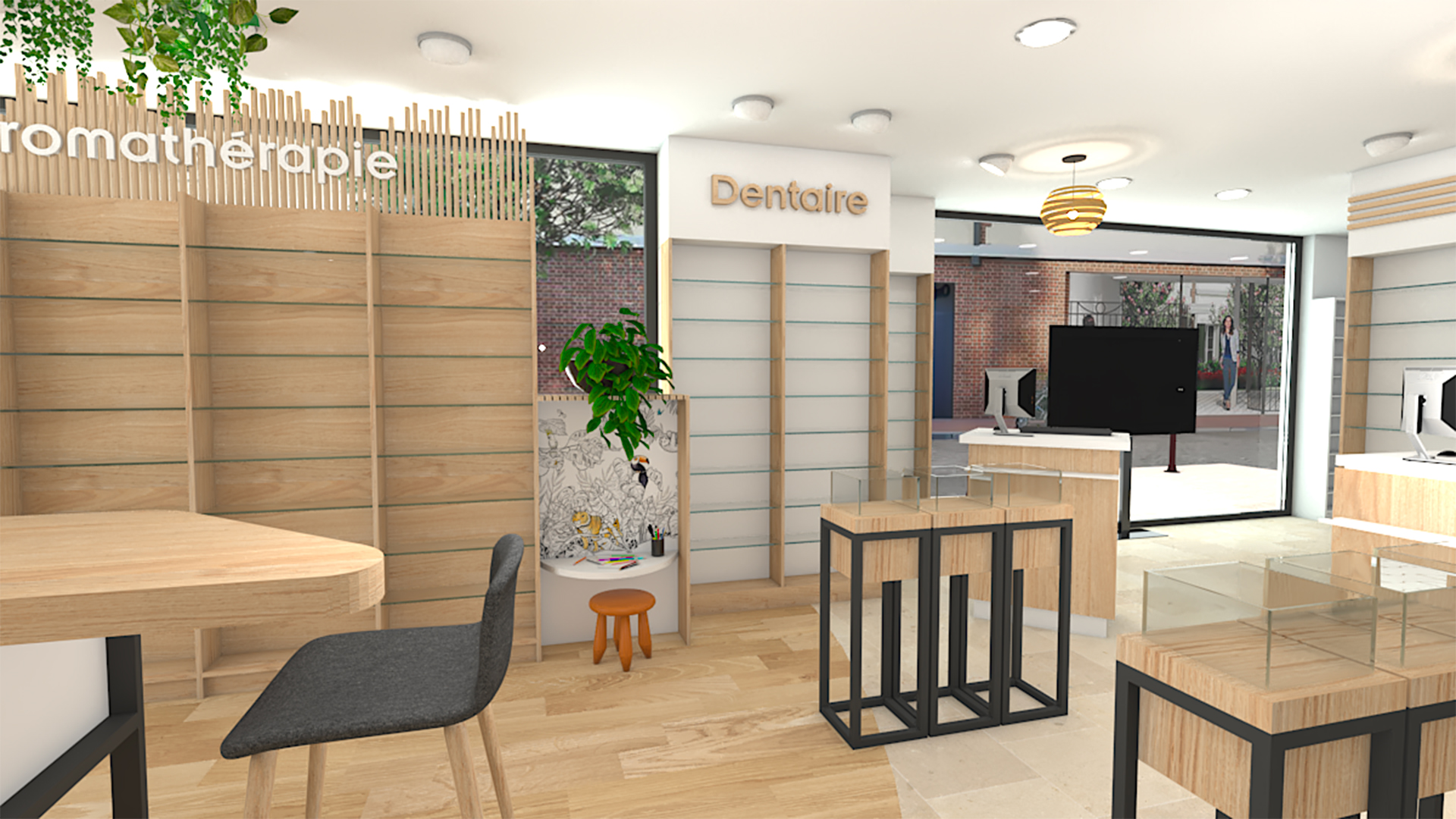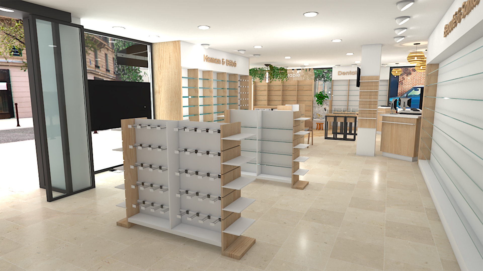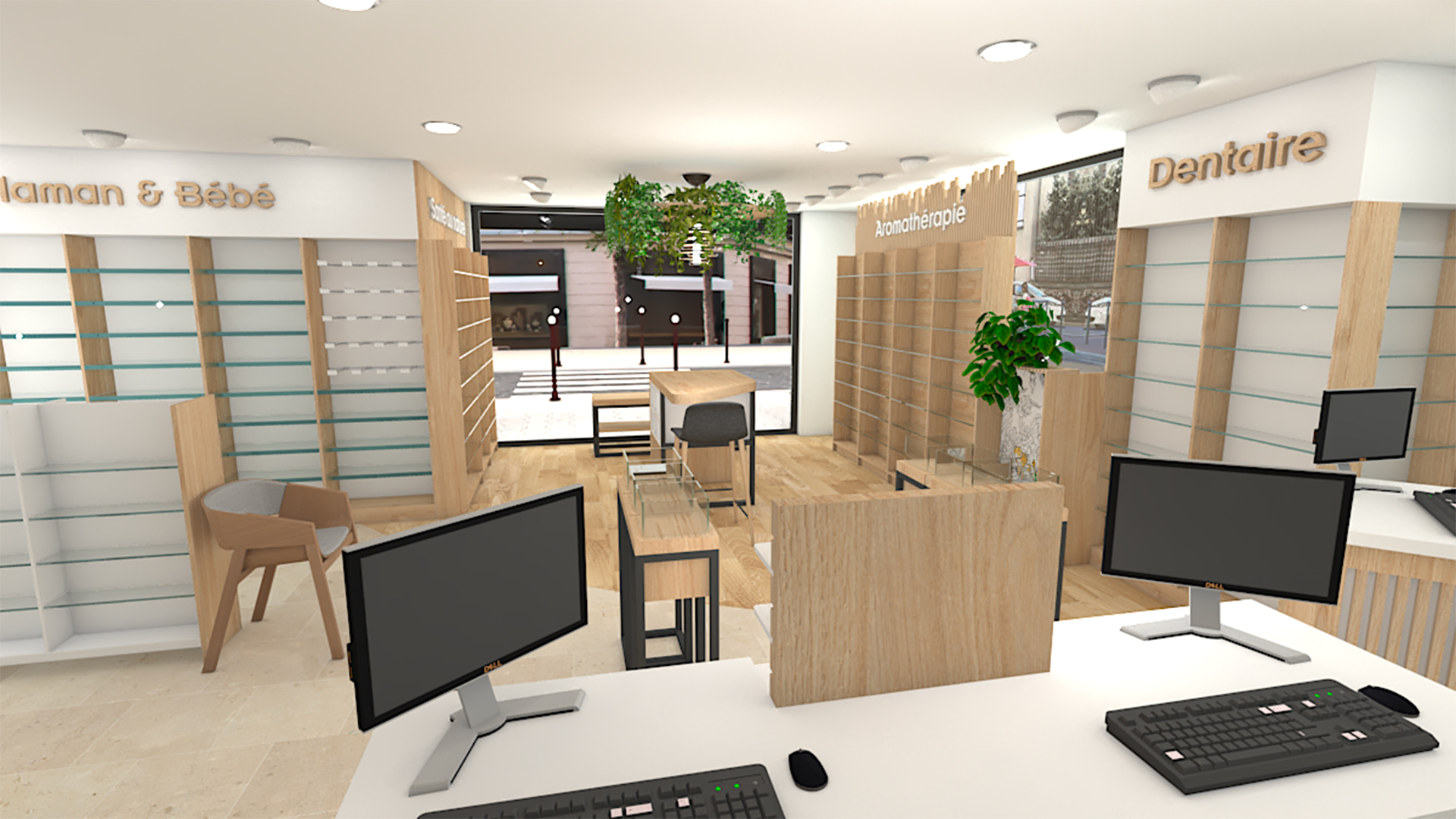 Notre cliente souhaitait une pharmacie moderne et fonctionnelle, alliant un style épuré et des matériaux chaleureux. Nous avons choisi des lignes nettes, un éclairage lumineux et du bois naturel pour créer une ambiance apaisante.