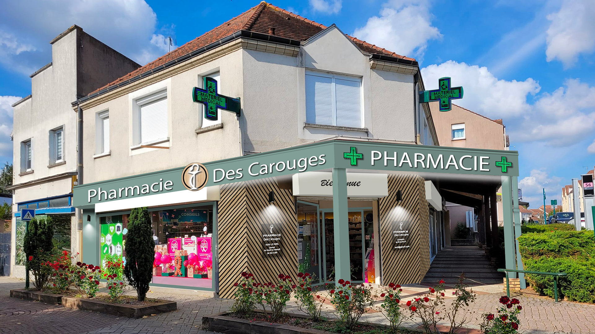 Ce design, combiné à une enseigne illuminée, renforce l’identité de la pharmacie, alliant esthétique et visibilité optimale.